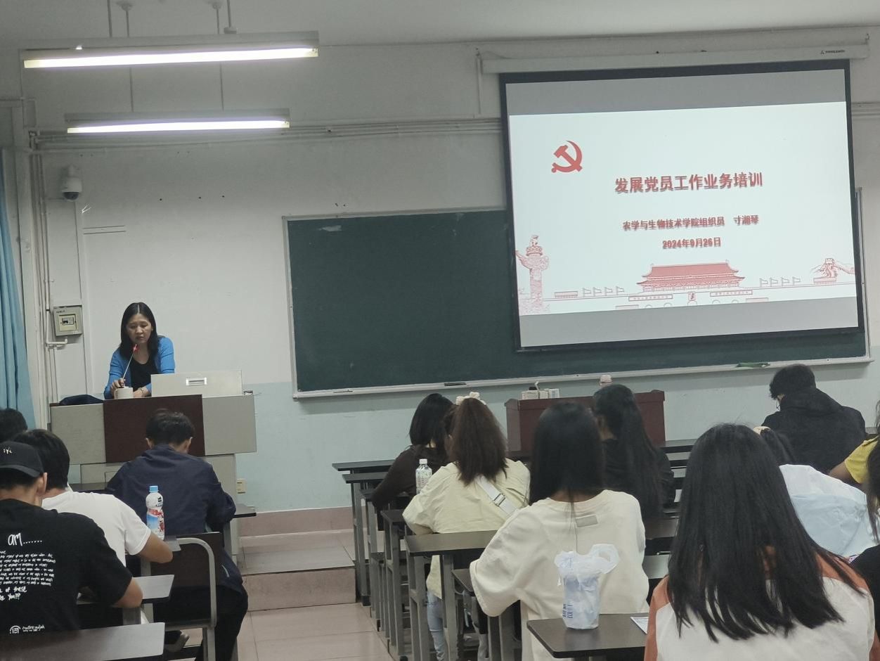 为培养高素质的党务工作人员队伍,进一步提高足球外围赔率 发展党员工作质量,足球外围赔率 党委于2024年9月26日在尚农楼3-15教室召开了发展党员工作业务培训会,由足球外围赔率 党委组织员寸湘琴对学生支委、培养联系人、入党介绍人、党建先锋队员等进行了业务培训。