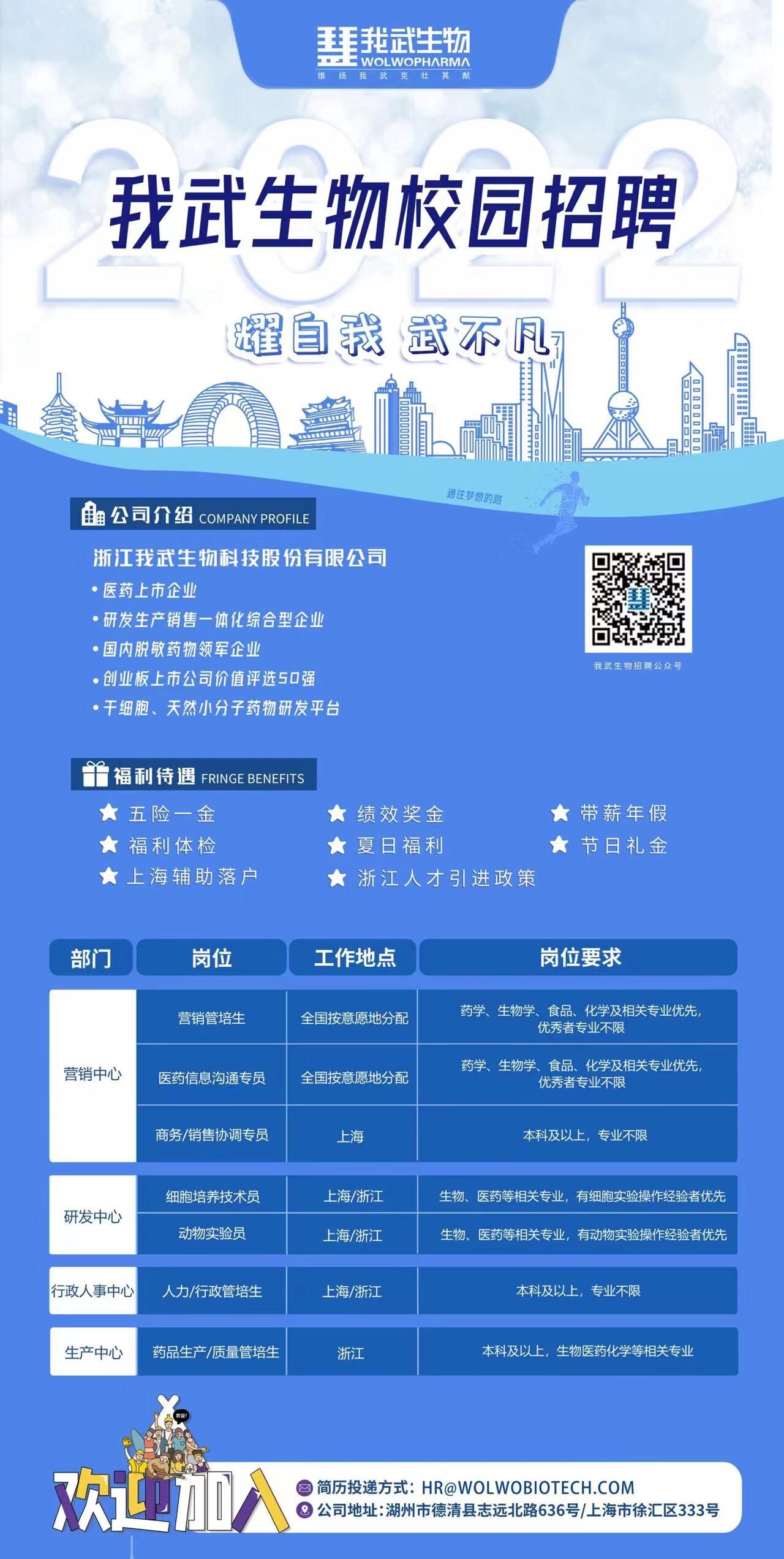 【我武生物 】秋季招聘开始了上市药企,集研发生产销售于一体,只发展创新药,脱敏行业龙头企业,创业板上市公司价值评选50强2023校园秋季招聘开始了!🤟宣讲地点:众创空间宣讲大厅宣讲时间:周三下午16:00(11月2日)招聘岗位:1、医药代表(20人,专业不限,药学、中药学、药品经营与管理、药物制剂、生物制药、市场营销等专业优先考虑)工作地点:可在省内或全国其他意向城市安排(云南省内全国城市均可选择)待遇:底薪+交通补贴+高额提成+五险一金+高温补贴+节日生日礼金+旅游+体检等2、生产、质检(10人,药学类、化学类、食品类、生物学等相关专业)工作地点:浙江3、实验员(药学专业,10人)工作地点:上海/浙江4、研发人员(医药相关专业10人)工作地点:浙江/上海5、人事行政(专业不限5-10人)工作地点:浙江/上海岗位还有很多,欢迎大家宣讲会现场详细了解。实习加就业一体,系统的岗前培训,有竞争力的薪酬,更重要的是一条通畅无阻的晋升渠道!投递简历:邮箱[email protected]或者线上直接投递。