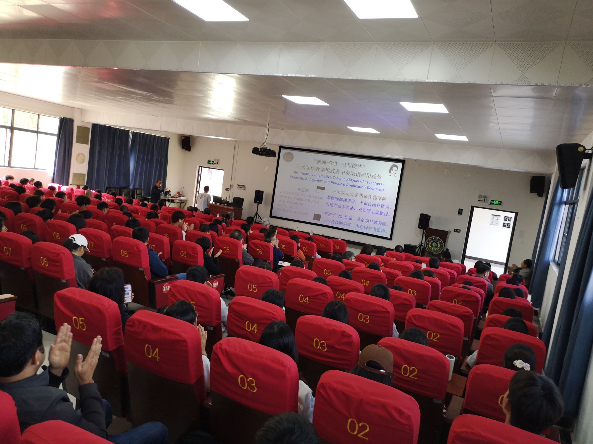 董教授现场演示了如何利用先进的AI大模型构建沉浸式双语教学环境。他提出,在AI赋能下,语言与专业知识的学习将不再是枯燥的记忆,而是结合具体场景的实战演练。董教授指出“教师-学生-AI智能体”三元互作教学模式就是以学生为中心,教师、学生、AI智能体三者互作的教学活动,其中包括AI智能体的课前、课中、课后的辅助功能。这种三元互作教学模式可显著提高教学效果,具有很多优点,如可突破教师教材课程的瓶颈限制,可充分利用国内外各种资源,可模拟各种场景使教学直观生动,缩小不同地区学校之间的差距,多种语言之间任意切换,激发提高学生的学习兴趣等等。报告会现场气氛热烈。